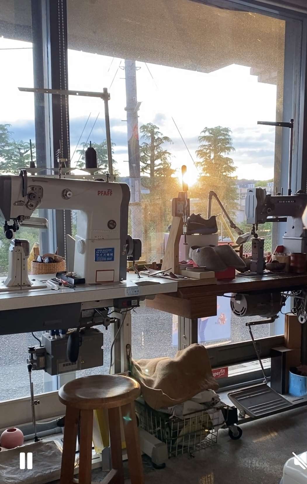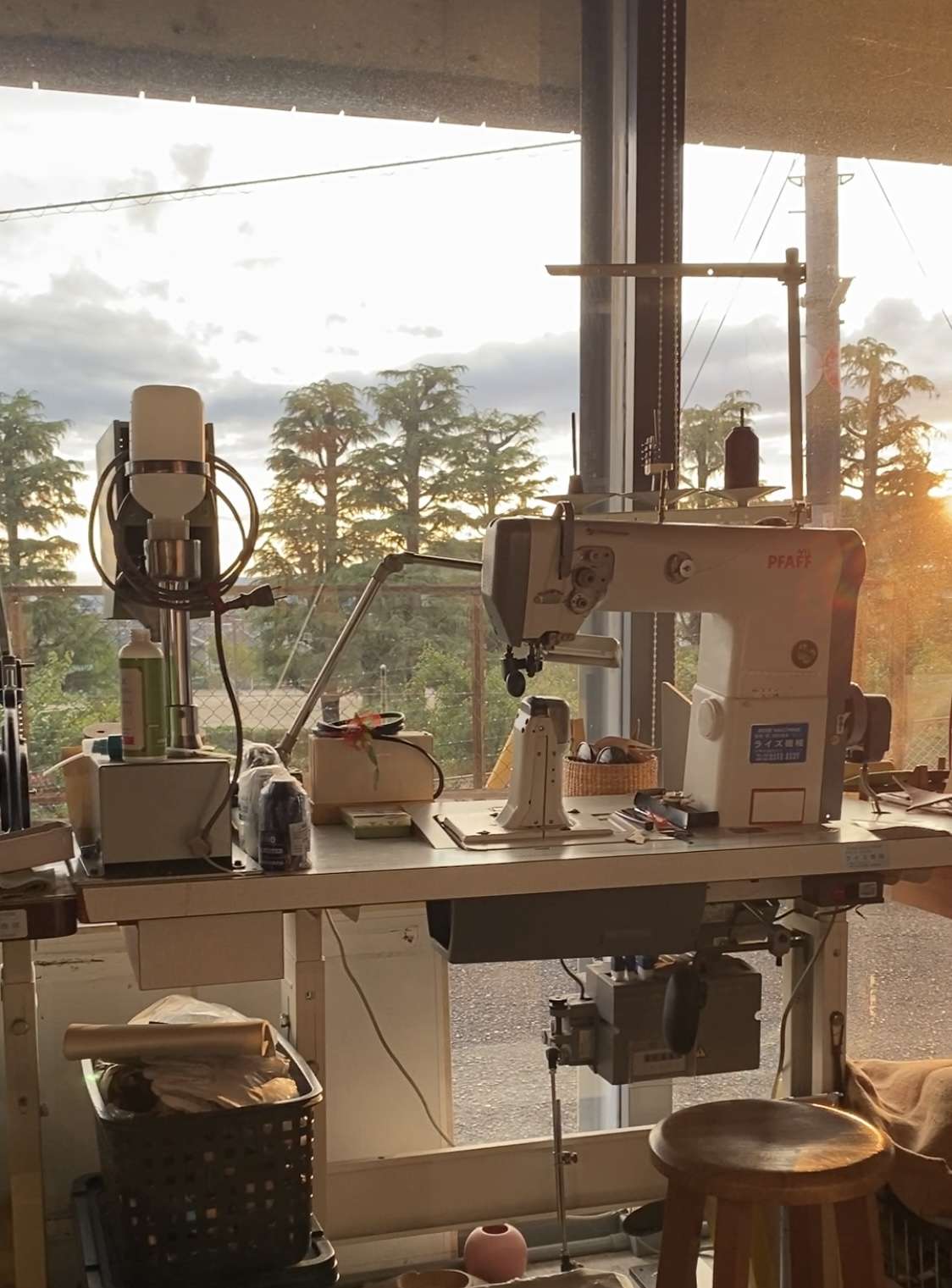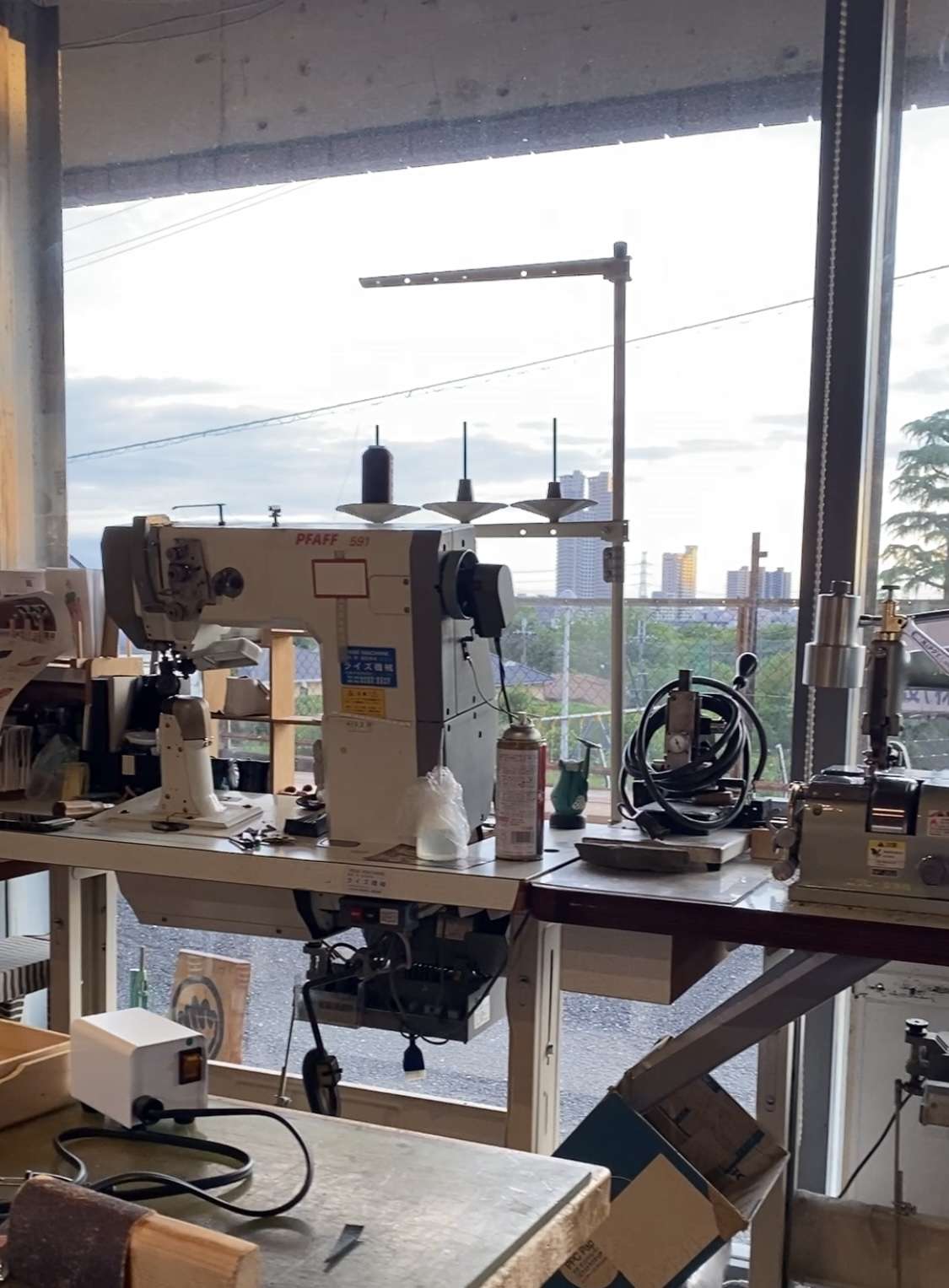 窓側にポストミシンを三台置いています。奥には、八方ミシン、平ミシン、ポストミシンが各一台。